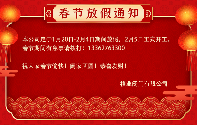 格業閥門定于1月20日-2月4日期間放假,2月5日正式開工。